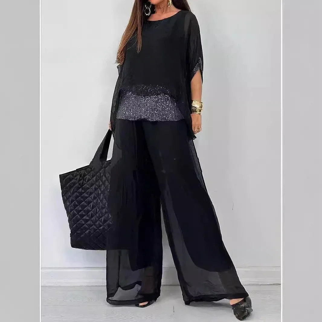 Completo femminile rappresenta un perfetto equilibrio tra comfort e raffinatezza. Realizzato in un tessuto fluido e leggero, il coordinato si compone di una blusa oversize e di un pantalone palazzo ampio, entrambi nella tonalità grigio fumo, sobria ed elegante.