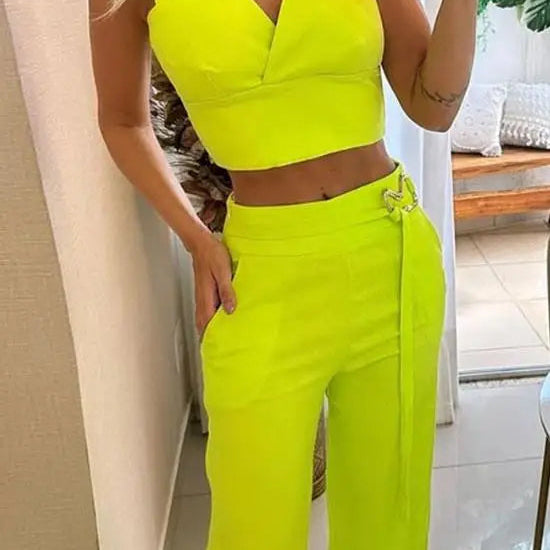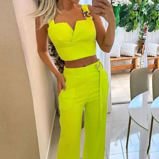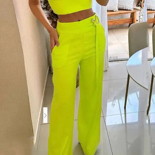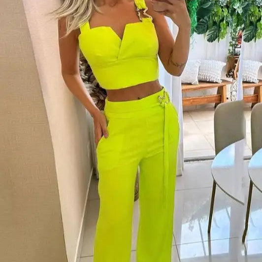 Completo da due pezzi da donna 2024 estate nuova moda casual sexy scollo a V senza maniche top pantaloni larghi a gamba larga set da due pezzi