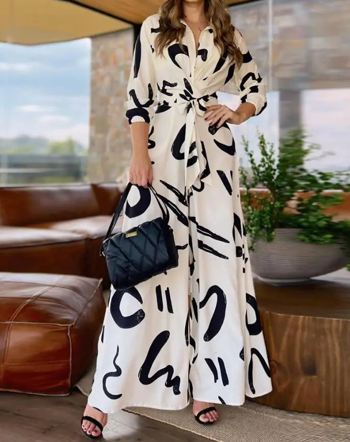 La tuta è caratterizzata da una stampa astratta in bianco e nero, con motivi calligrafici o pittorici che conferiscono un tocco artistico e moderno al capo. La parte superiore ha un colletto classico con chiusura a bottoni, che dona un aspetto sofisticato e strutturato. Le maniche lunghe, leggermente ampie, si chiudono ai polsi con polsini e bottoni, aggiungendo un dettaglio elegante.