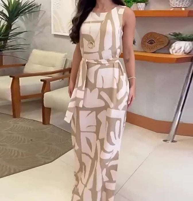 Questo elegante vestito lungo unisce stile e comfort, perfetto per la primavera e l'estate. Realizzato in poliestere con una leggera elasticità, offre una vestibilità regolare e una silhouette dritta che valorizza la figura. Il modello senza maniche, con scollo rotondo (O-Neck) e chiusura a pullover, garantisce praticità e libertà di movimento. La stampa astratta aggiunge un tocco moderno e sofisticato, mentre la vita naturale assicura un'ottima vestibilità. La lunghezza fino al pavimento e il taglio dritto rendono questo abito ideale per diverse occasioni, mantenendo sempre un look raffinato e alla moda. Privo di sostanze chimiche di alta preoccupazione, è un'opzione sicura e versatile per chi desidera un outfit fresco ed elegante per le giornate più calde.